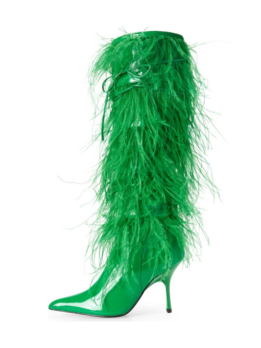 Patent Leather Pointed-Toe Faux Feather Wide Mid Calf Stiletto Boots - Green