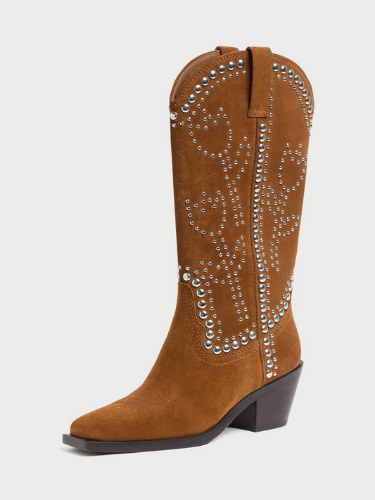 Brown Faux Suede Floral Studded Wide Mid Calf Tall Cowgirl Boots