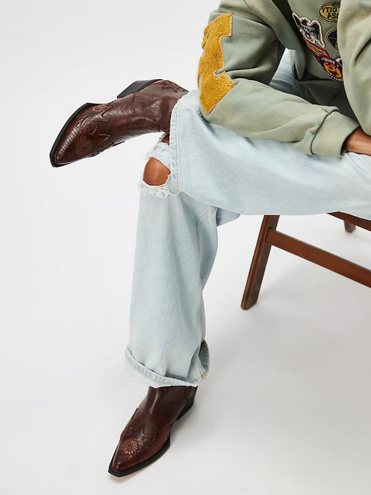 Brown Floral Applique Snip-Toe Wide Mid Calf Cowgirl Boots