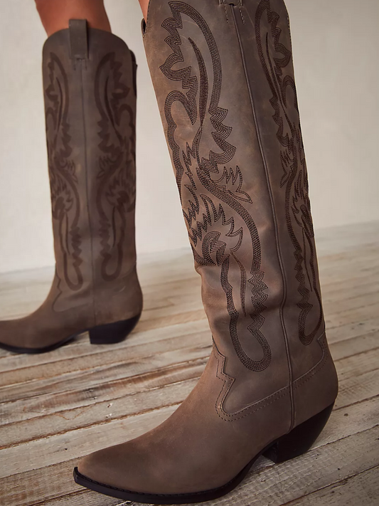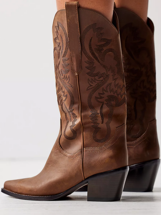 Brown Embroidery Pointed-Toe Tall Wide Mid Calf Western Boots For Women
