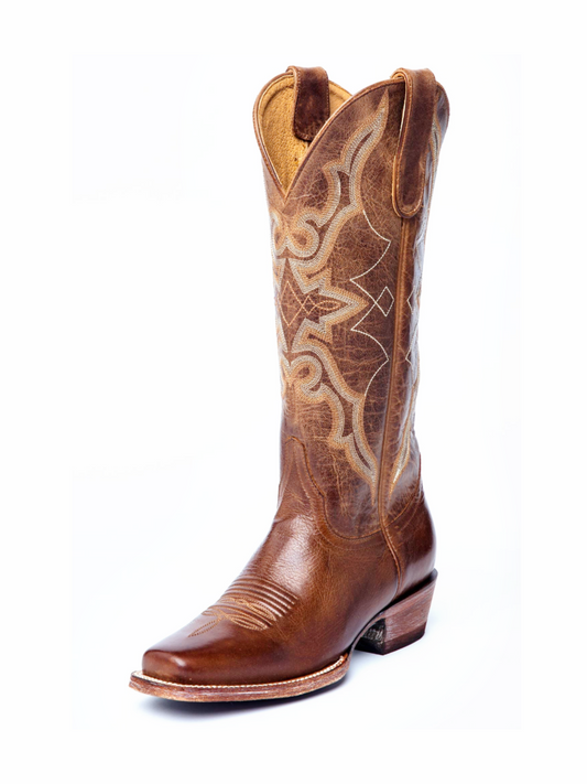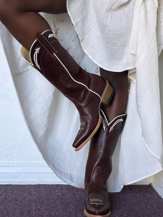 Brown Snip-Toe Coiling Embroidery Wide Mid Calf Tall Cowgirl Boots