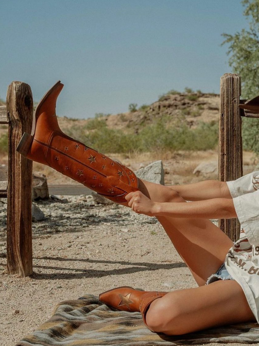 Brown Faux Suede Snip-Toe Star Burst Embroidery Wide Calf Tall Knee High Cowgirl Boots