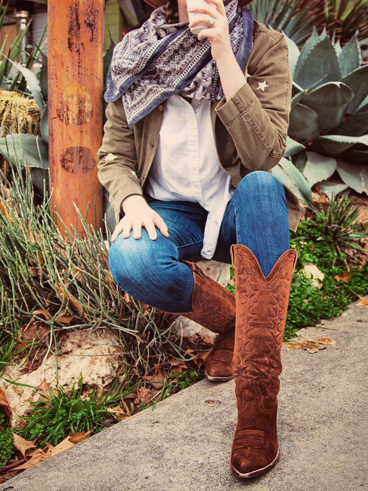 Brick Red Faux Suede Snip-Toe Wide Mid Calf Cowgirl Tall Boots With White Floral Inlay
