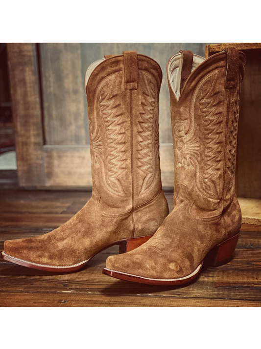 Brown Faux Suede Padded Embroidery Pointed-Toe Wide Mid Calf Tall Cowgirl Boots