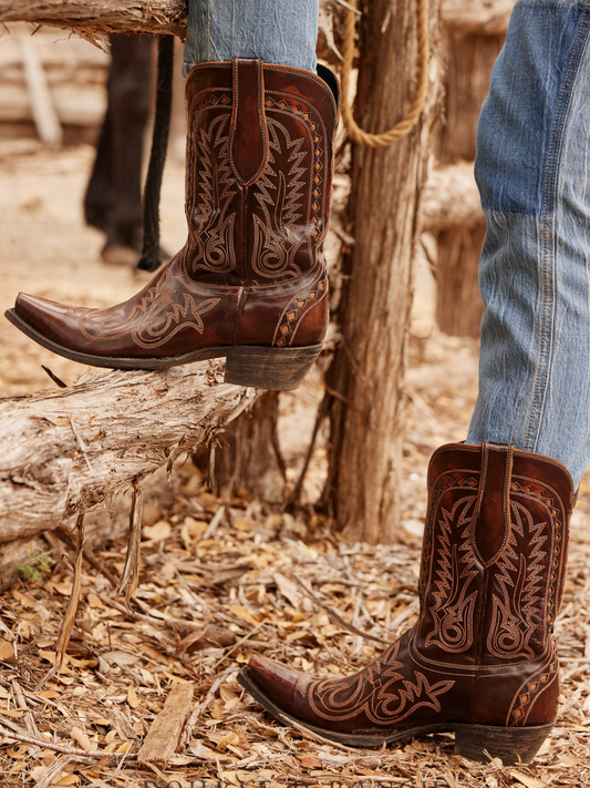 Burnish Cognac Vegan Leather Snip-Toe Embroidery Wide Mid Calf Cowgirl Tall Boots