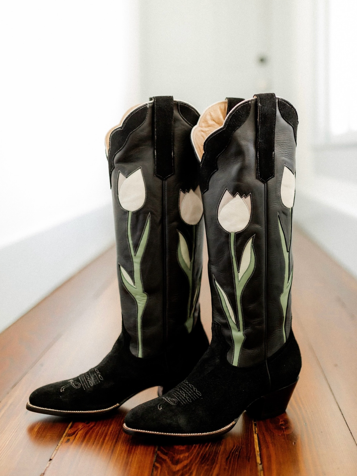 Step into a world of elegance and bold charm with these boots. The almond-toe design creates a sleek silhouette, while the striking tulip inlay blooms gracefully on the shaft, bringing a delicate touch to the rugged style. The mix of vegan leather and faux suede offers a rich contrast.