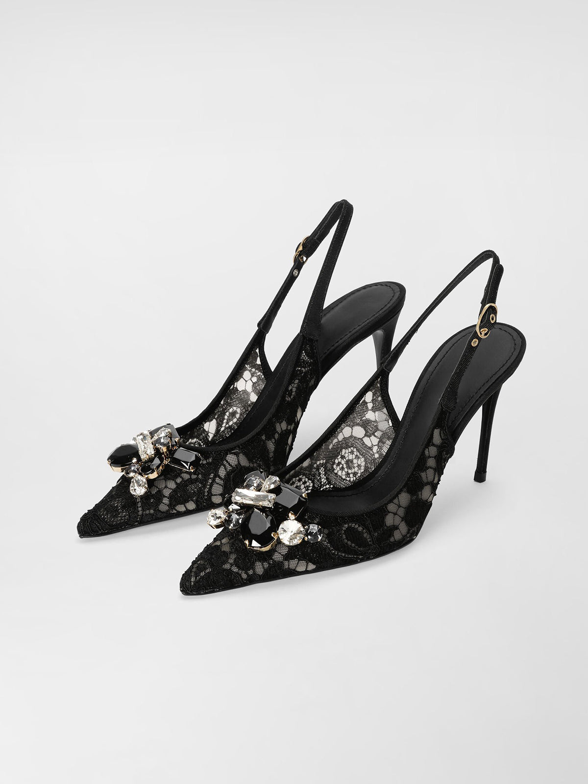 Romantic and luminous, these pumps feature a delicate lace mesh upper with a sharp pointed-toe silhouette, finished with sparkling crystal embellishments at the front. The slingback design offers a secure, elegant fit, while the airy mesh texture adds lightness and refinement—perfect for weddings, parties, or graceful statement looks.