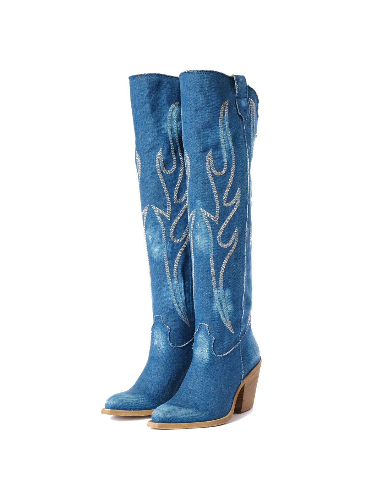 Blue Denim Snip-Toe Half-Zip Chic Embroidery Knee High Cowgirl Boots