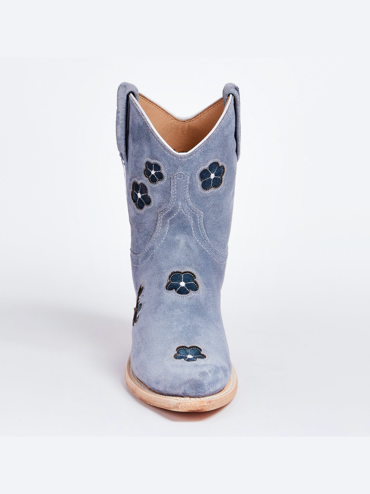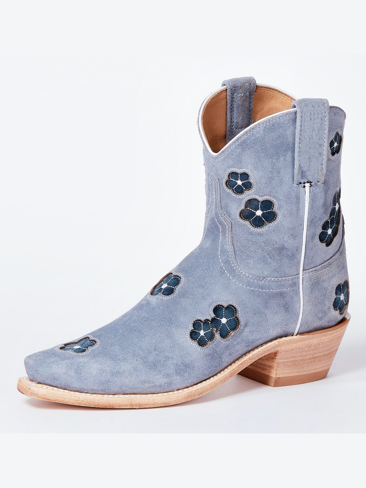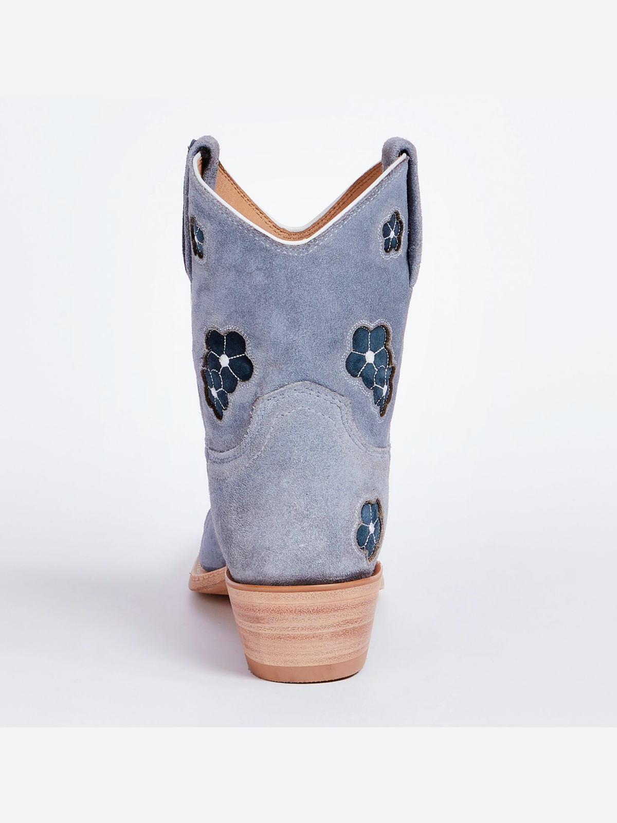 Blue Faux Suede Snip-Toe Cowgirl Ankle Booties With Black Flower Inlay