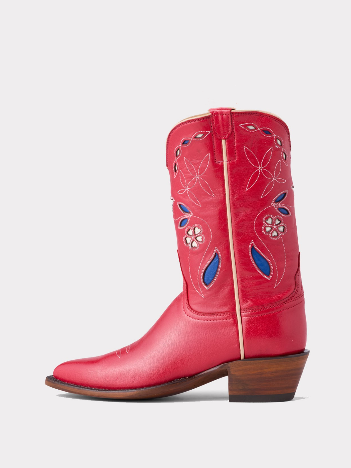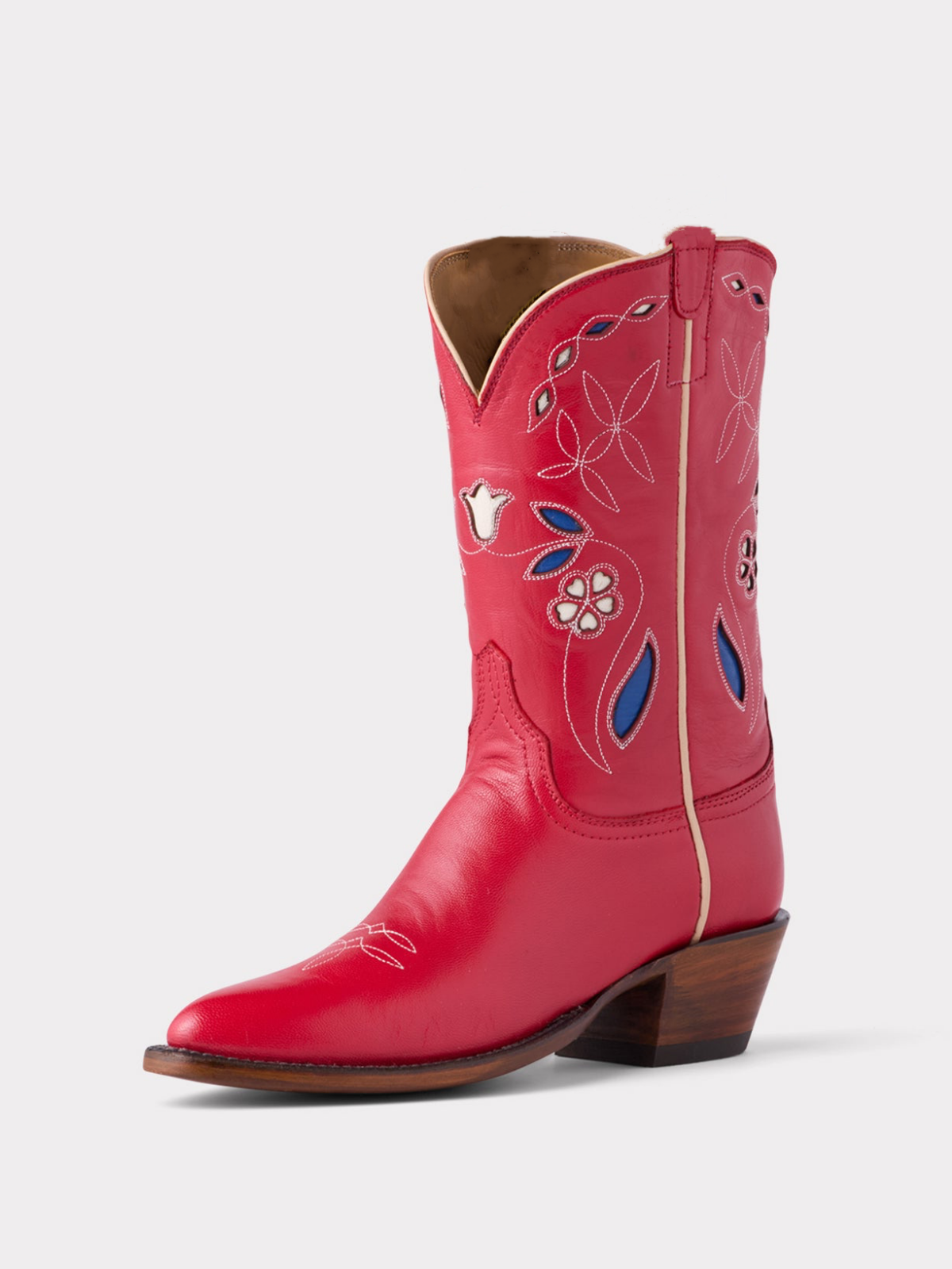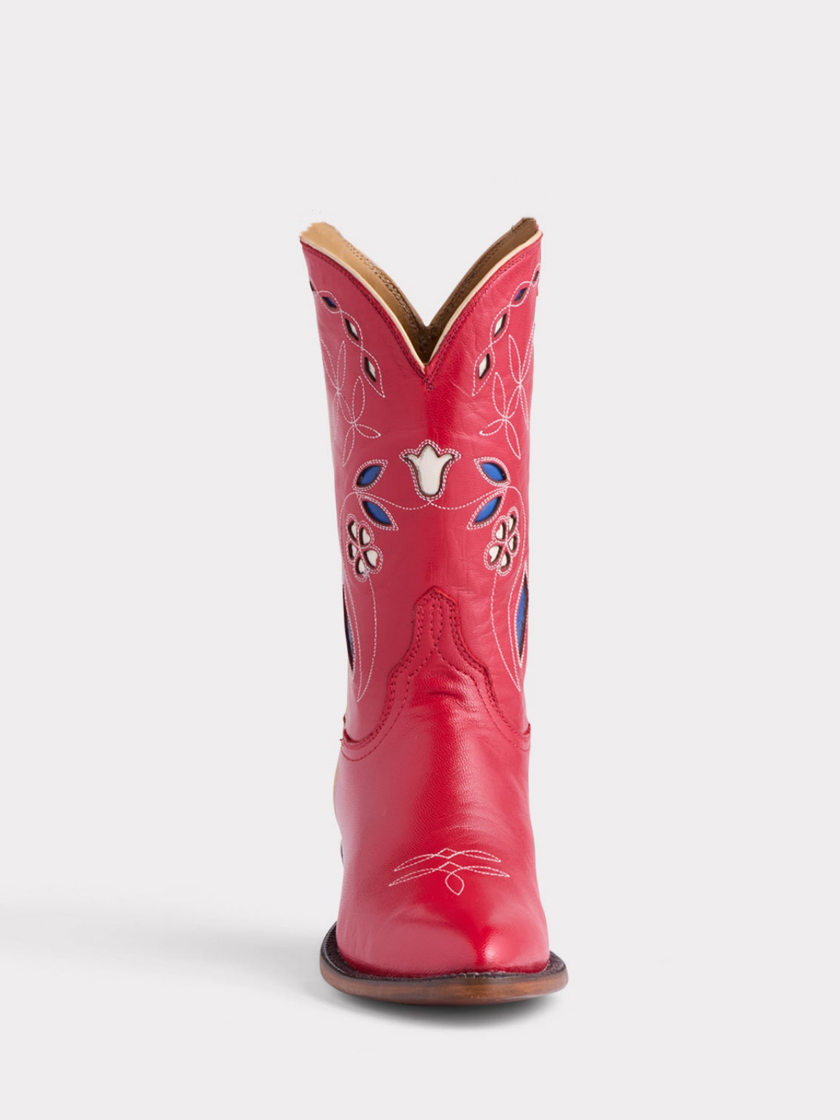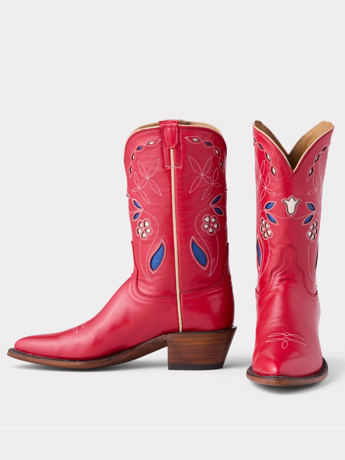Like vibrant blossoms blooming beneath your feet, these boots take you on an adventure where romance and wildness coexist. The exquisite floral inlays on the bright red background resemble a blooming work of art, infusing every step with energy and grace. With each stride, these boots make it feel as though you're walking down a path lined with flourishing flowers.