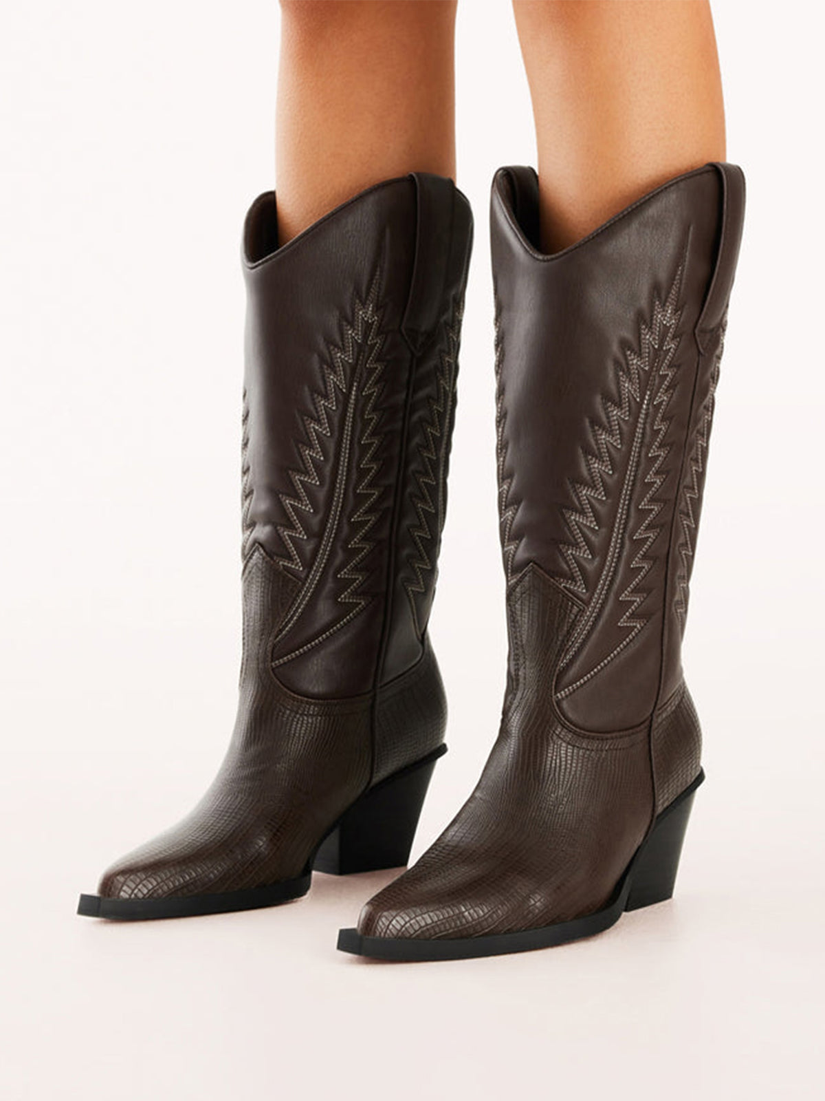 Rich tones meet classic western flair in these mid-calf cowgirl boots. Designed with a sleek pointed toe and detailed embroidery, they bring timeless cowboy attitude with a refined, everyday-wear edge—perfect for elevating both casual and statement looks.