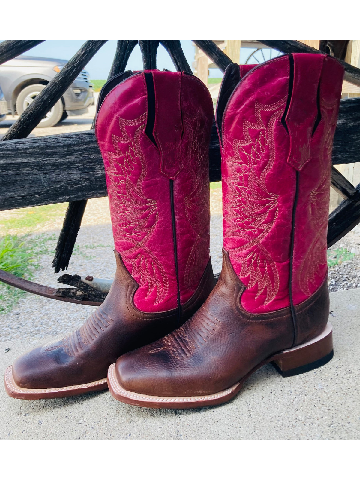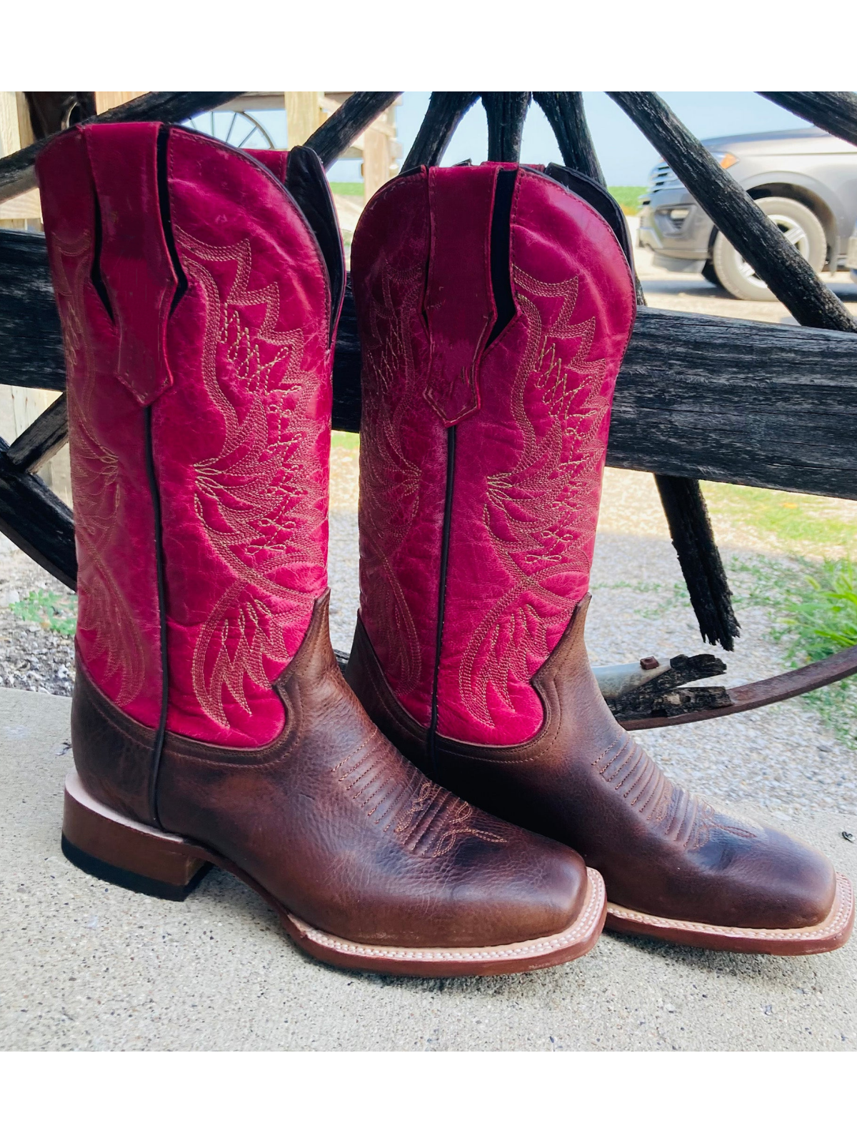 Step into the spotlight with our cowgirl boots. These boots perfectly combine earthy tones with bold, vibrant colors. The rich brown vegan leather contrasts strikingly with the eye-catching fuchsia shaft, making these boots a true standout. The square-toe design adds a touch of modern flair to a classic style, while the intricate embroidery showcases an undeniable artisanal beauty. Whether you’re heading to a rodeo or walking the fashion runway, these boots will ensure you stand out with a unique style.