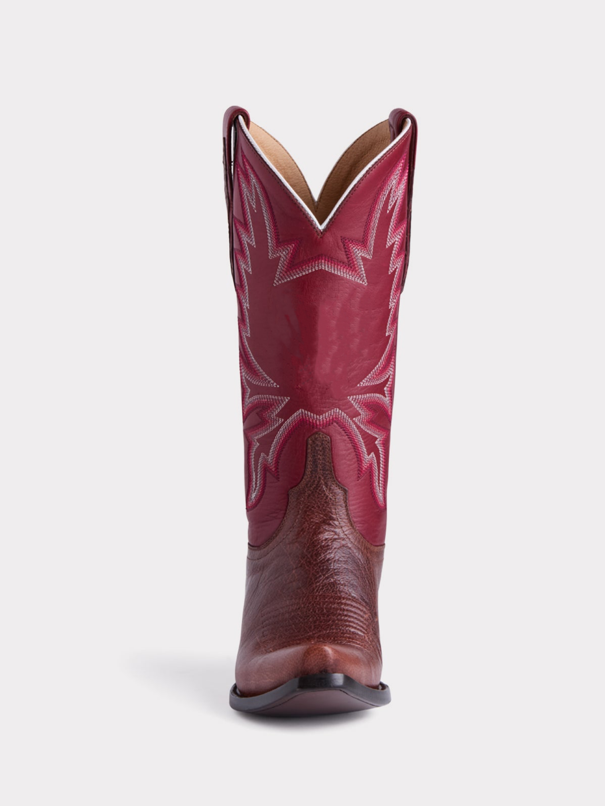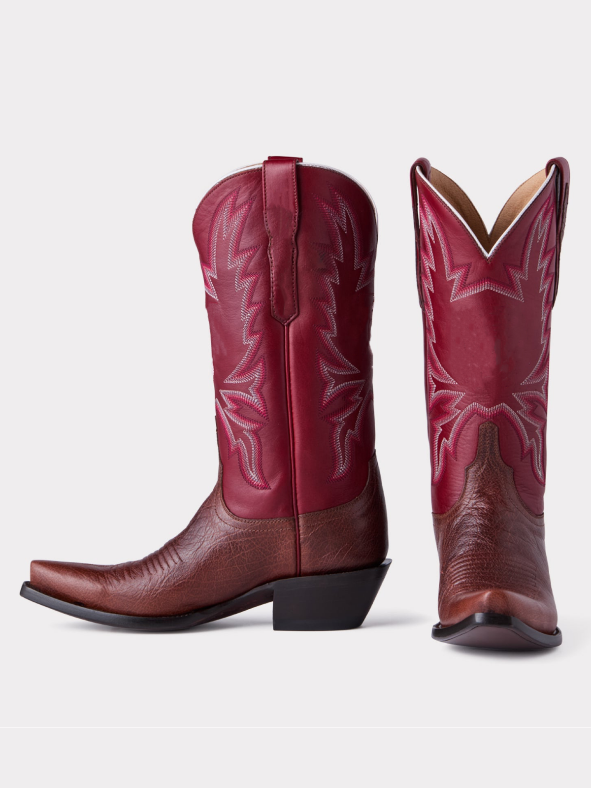 In the bold clash of deep chocolate and fiery red, these boots take you on a blazing adventure. The exquisite embroidery on the shaft dances like flames, infusing every step with boundless energy and passion. The mid-calf design hugs the leg perfectly, while the snip-toe adds a sharp and dynamic touch to the overall look.