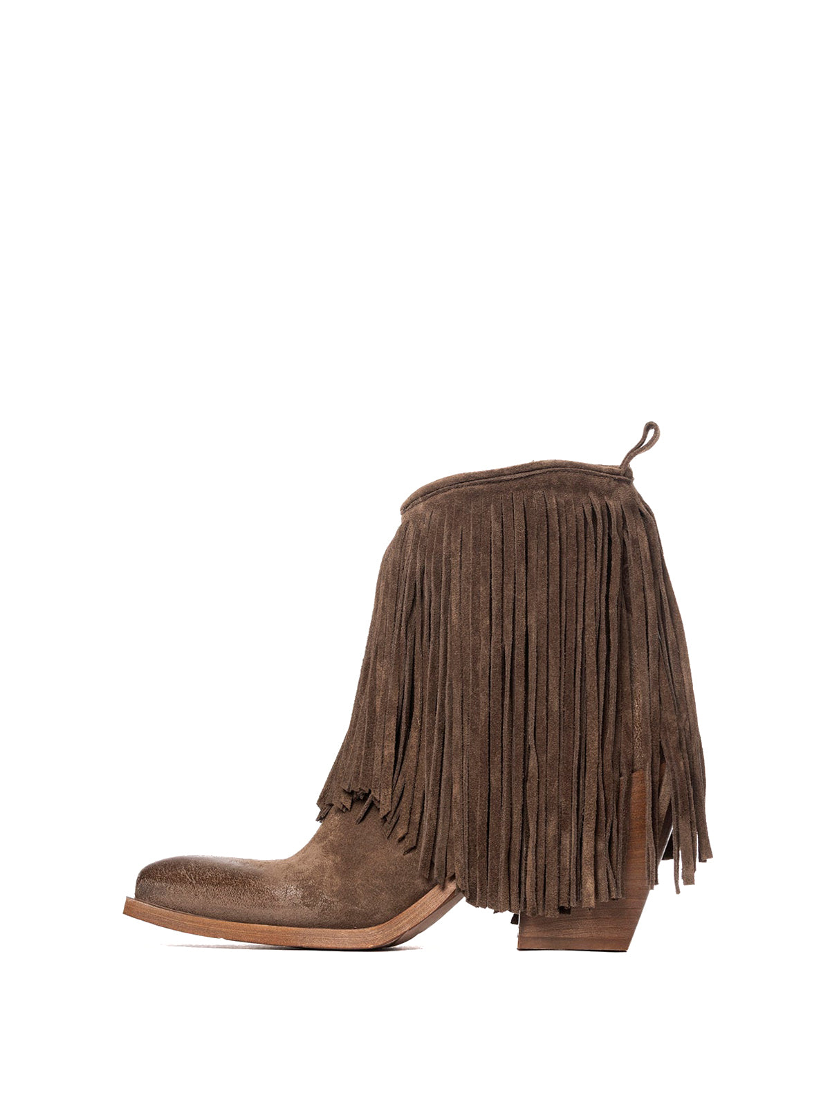 Dark Brown Faux Suede Snip-Toe Fringe Full-Zip Ankle Cowgirl Boots