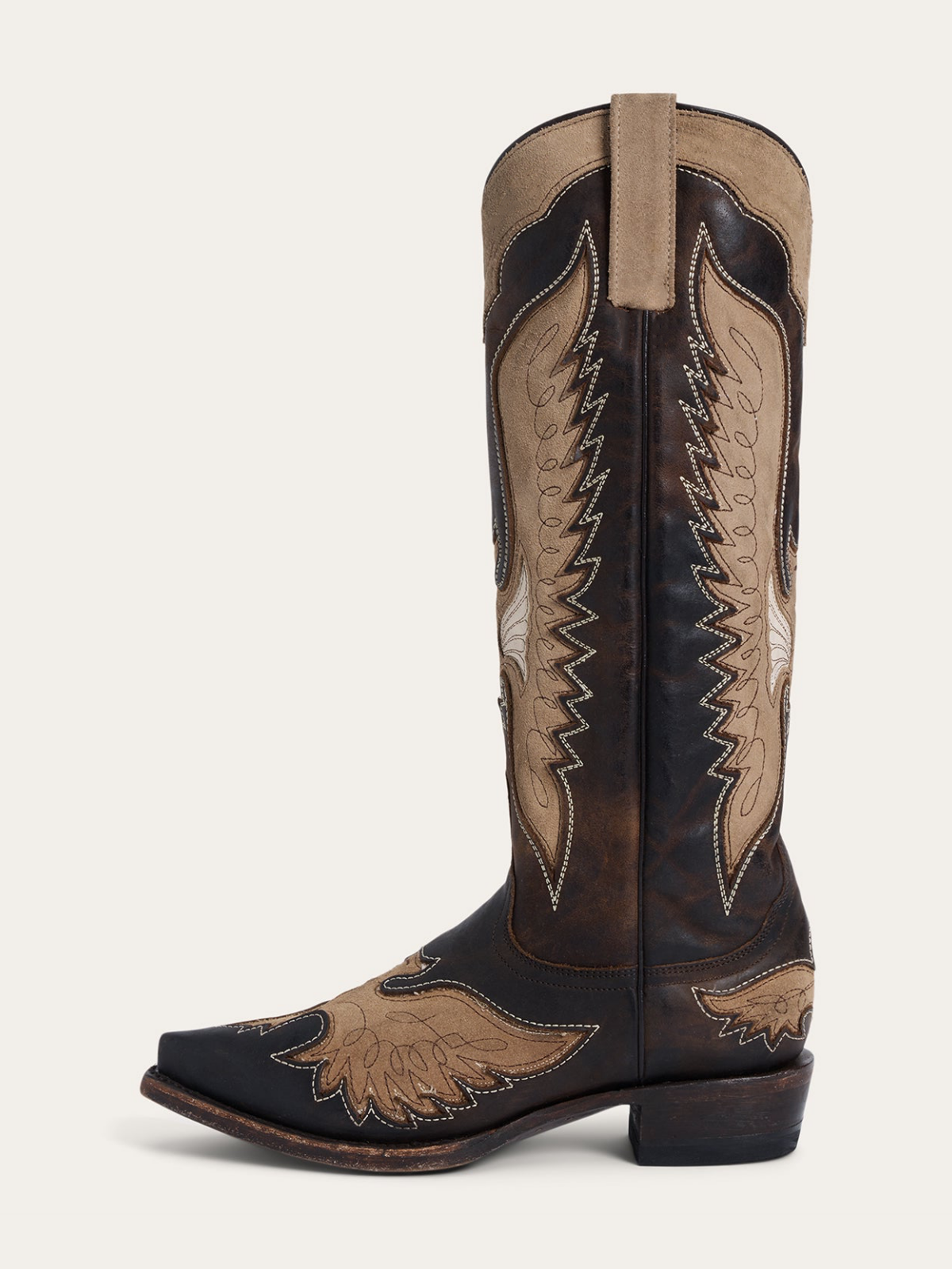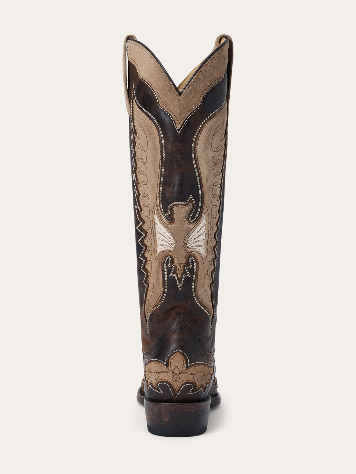 Step into these boots, and it feels as though you're merging with the vast Western landscape. The deep brown vegan leather is reminiscent of rich earth, while the eagle inlay glistens in the sunlight, symbolizing strength and freedom. The tall shaft hugs your calves perfectly, embodying a seamless blend of elegance and resilience.