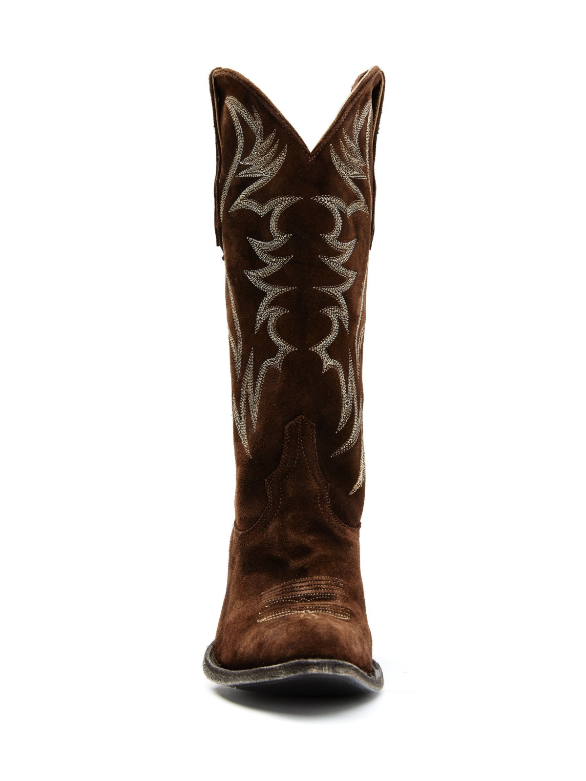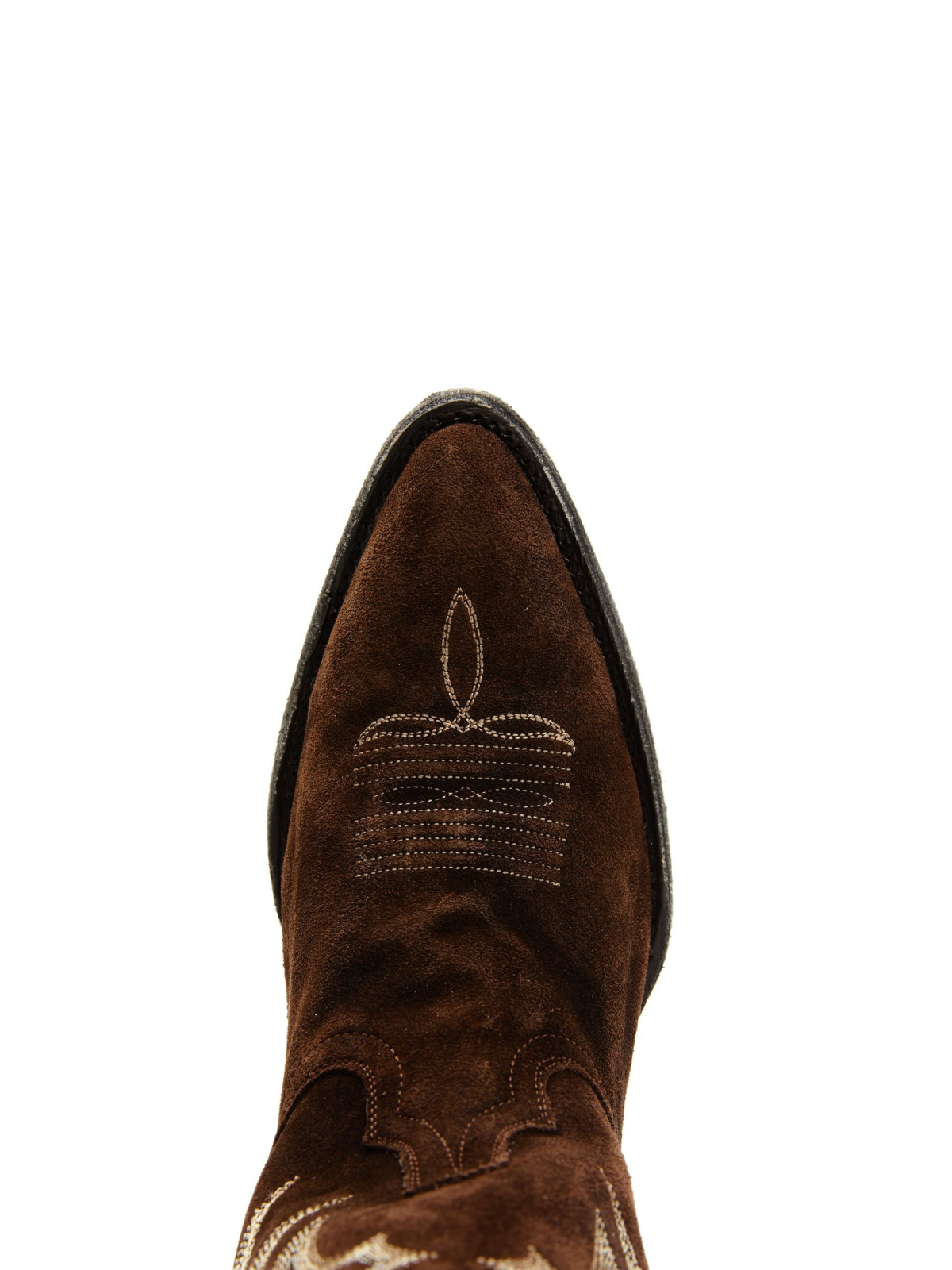 Faux Suede Wings Embroidery Pointed-Toe Mid Calf Cowgirl Boots - Brown