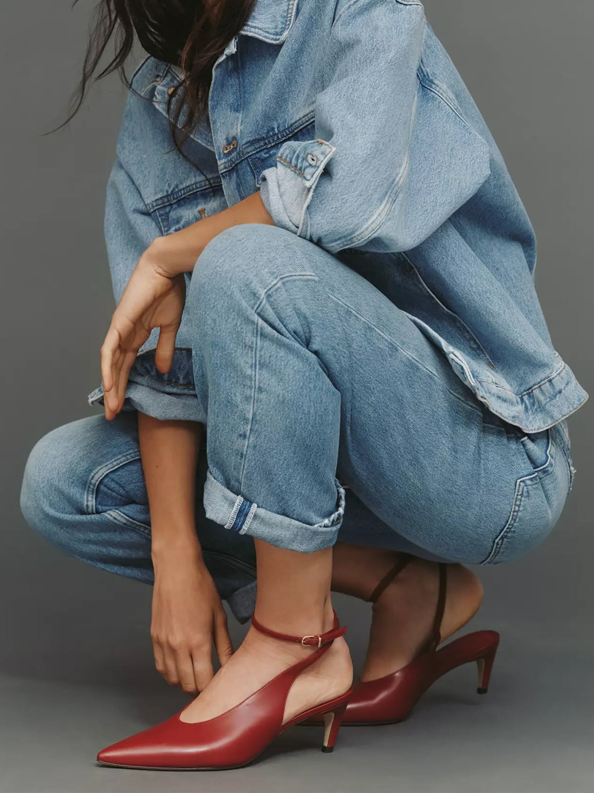 Designed in a striking hue, these heels feature a sleek slingback silhouette paired with a delicate buckle ankle strap for a refined, chic finish. The low kitten heel offers graceful lift and all-day comfort, making them perfect for both polished work looks and elegant outings.
