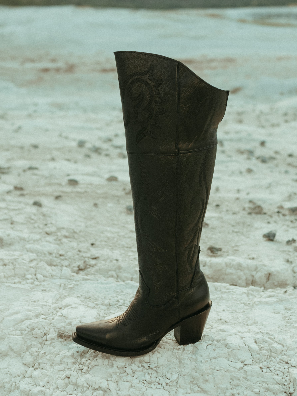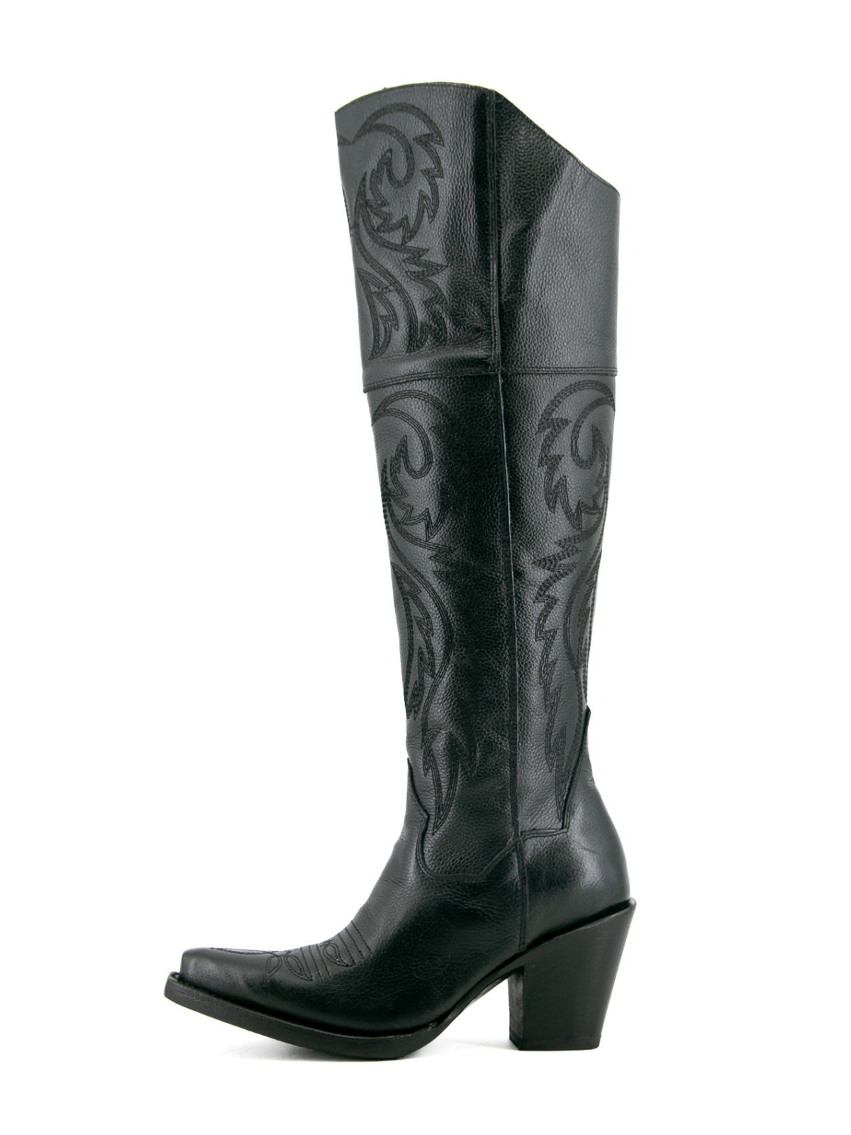 Snip-Toe Embroidery Tall Half-Zip Knee High Cowgirl Boots - Black