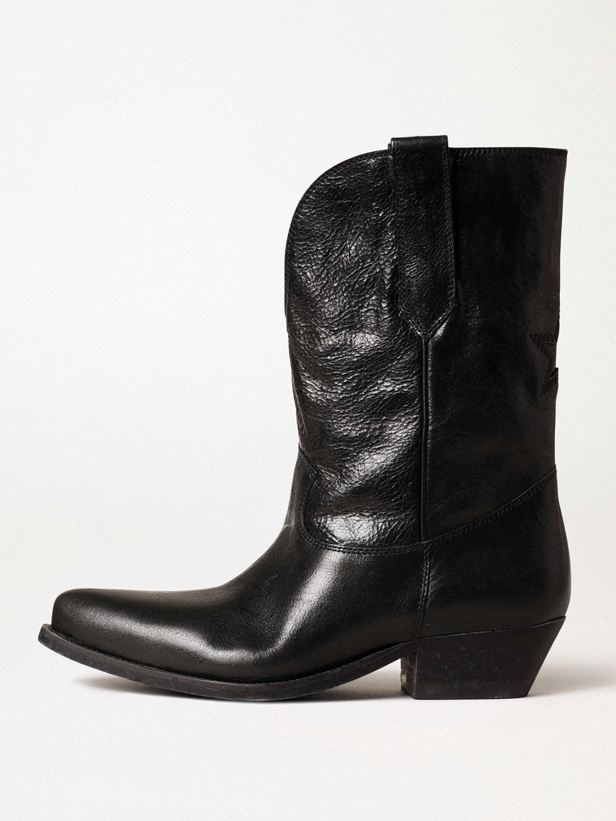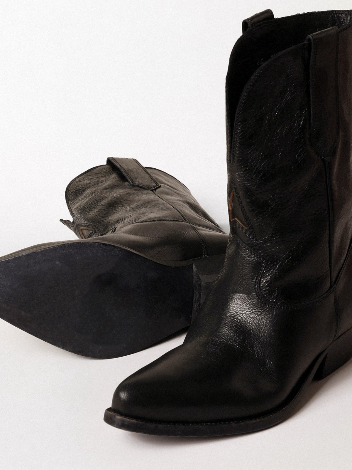 Slip into these black cowgirl boots and find yourself in a beautiful world where elegance and the magic of the stars blend seamlessly. These wide mid-calf boots combine comfort with cosmic beauty, as if your feet are sprinkled with stardust, ready to embark on an adventurous journey.