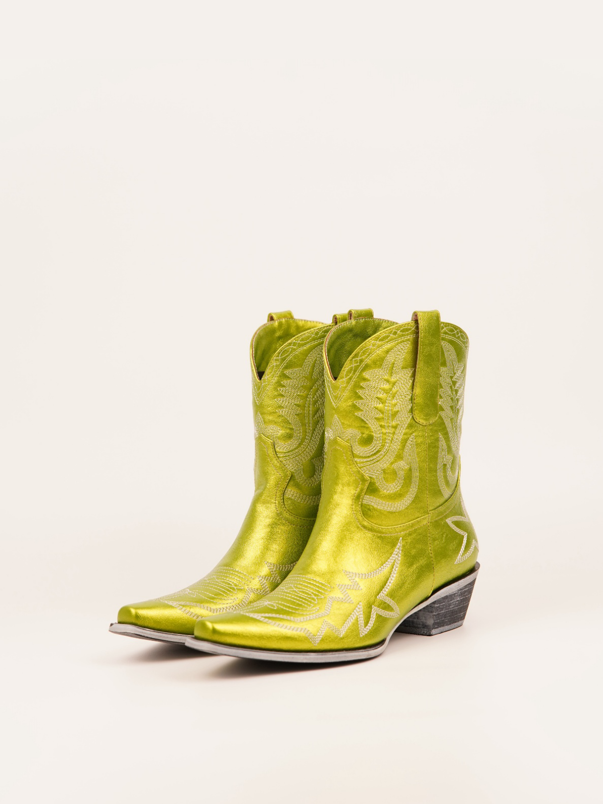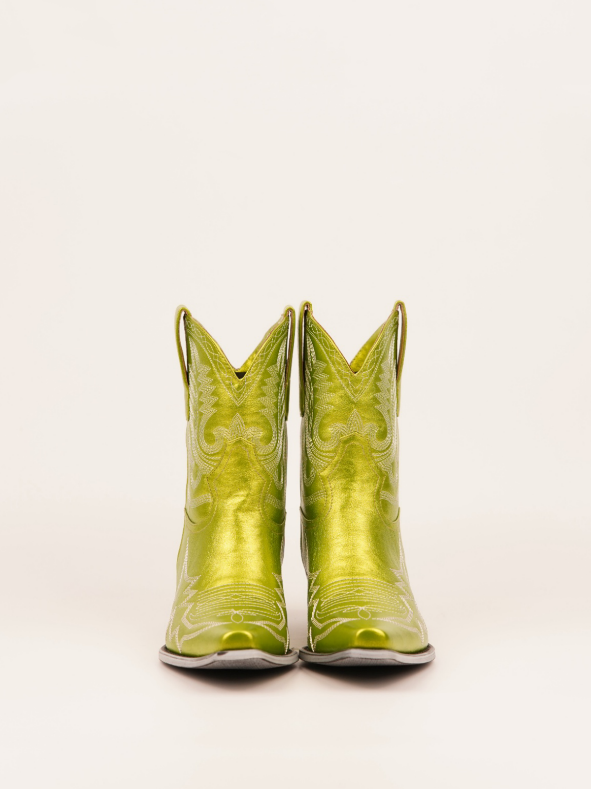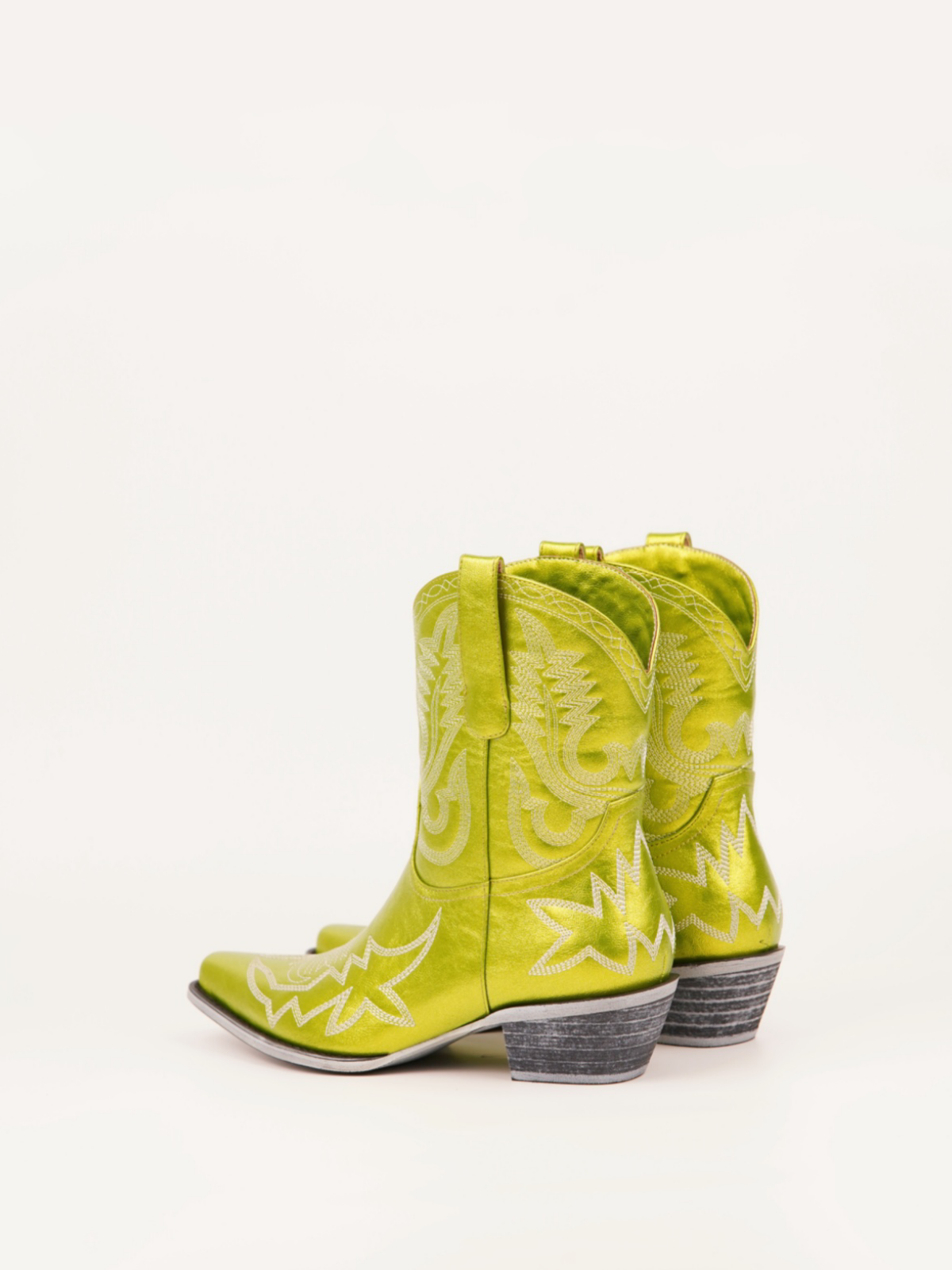 Elevate your Western-inspired wardrobe with these stunning boots. Made from green metallic vegan leather with cream embroidery in a jagged, multi-row stitch pattern reminiscent of grass, these boots feature a deeply scalloped collar and traditional pulls, offering a perfect blend of modern style and classic craftsmanship.