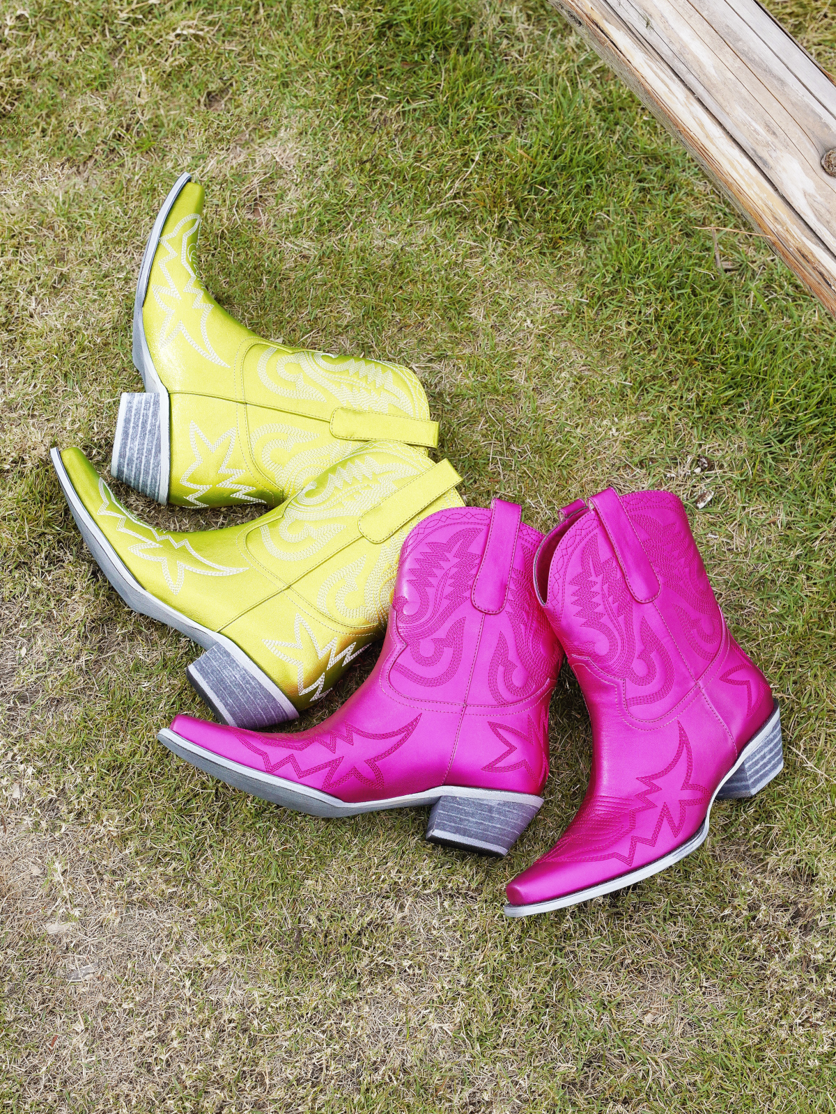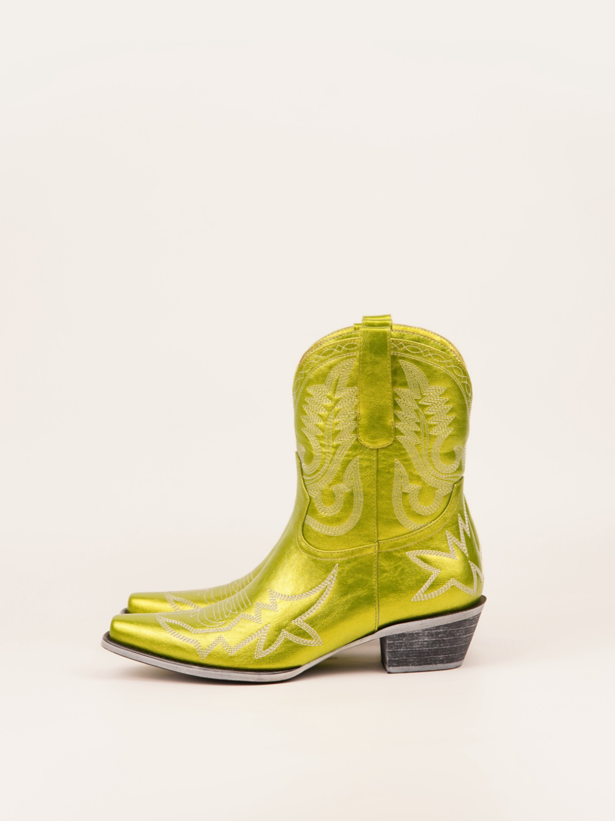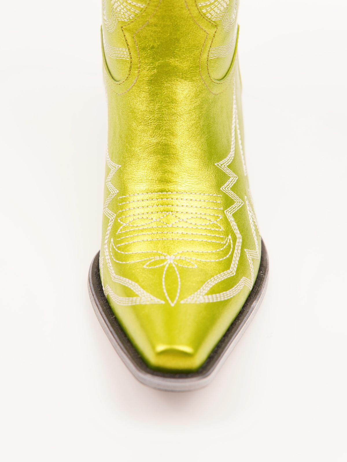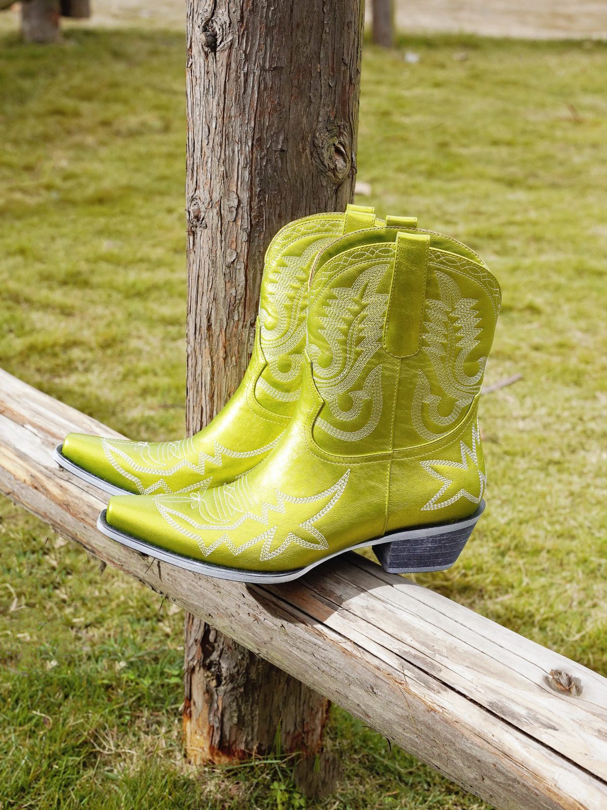Elevate your Western-inspired wardrobe with these stunning boots. Made from green metallic vegan leather with cream embroidery in a jagged, multi-row stitch pattern reminiscent of grass, these boots feature a deeply scalloped collar and traditional pulls, offering a perfect blend of modern style and classic craftsmanship.