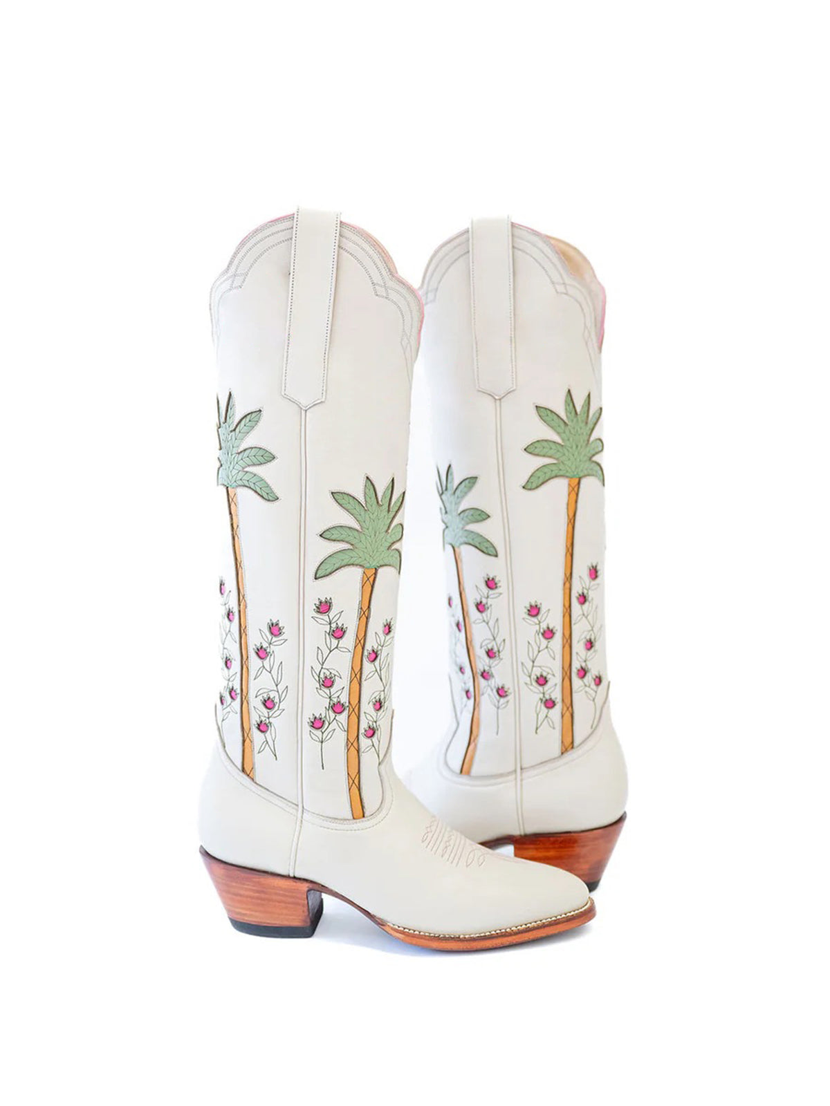 Step into a world of serene elegance with these boots. The soft white shade evokes calm skies, while the intricate palm and flower inlays wrap around the shaft like a breeze through a blooming garden. The almond-toe silhouette adds a graceful touch, and the wide calf design ensures comfort with every stride.
