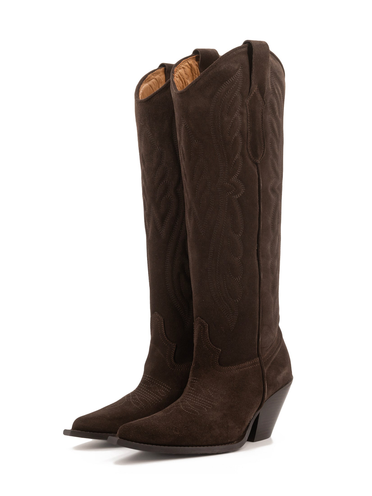 Wing Embroidery Faux Suede Pointed-Toe Wide Calf Tall Knee High Cowgirl Boots - Chocolate