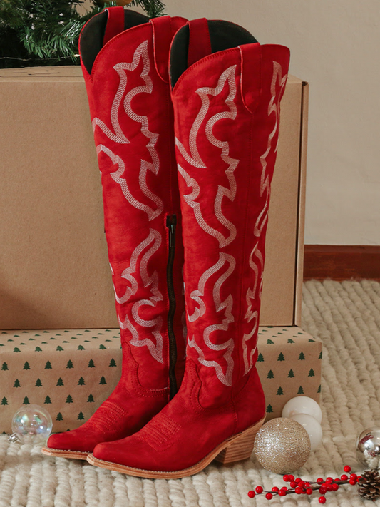 Red Faux Suede Embroidery Pointed-Toe Half-Zip Over-The-Knee Cowgirl Boots