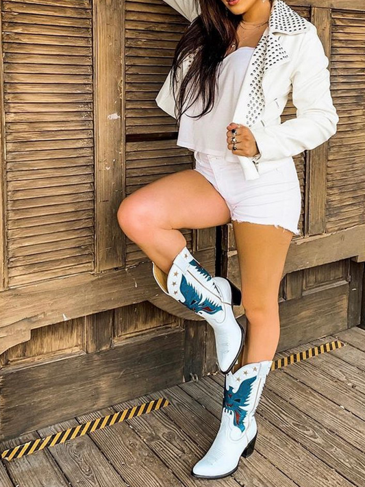 White Snip-Toe Embroidery Mid Calf Western Boots For Women