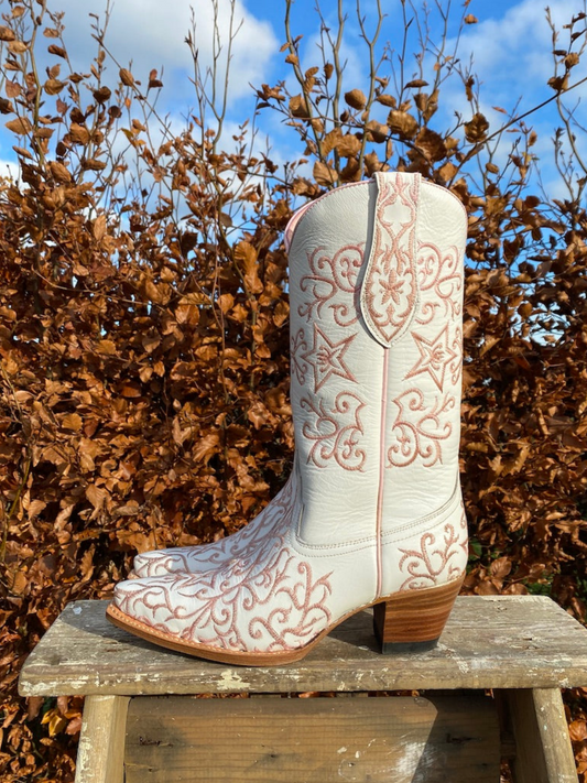 White Snip-Toe Pink Embroidery Wide Mid Calf Cowgirl Boots