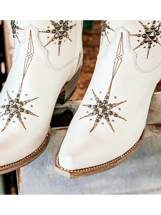 White Snip-Toe Studded Stars Full-Zip Mid Calf Cowgirl Boots