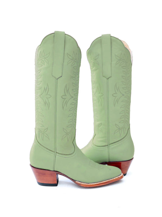 Almond-Toe Leaves Embroidery Wide Calf Knee High Cowgirl Boots - Matcha Green