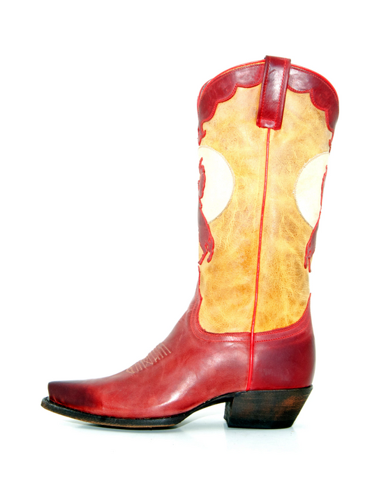 Distressed Contrast Red And Tan Snip-Toe Cowboy Applique Wide Mid Calf Cowgirl Boots