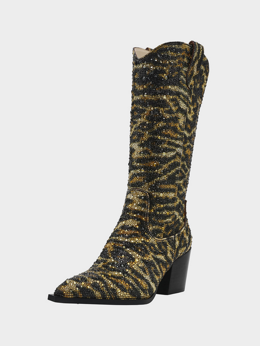 Leopard Round-Toe Rhinestone Half-Zip Mid Calf Cowgirl Boots