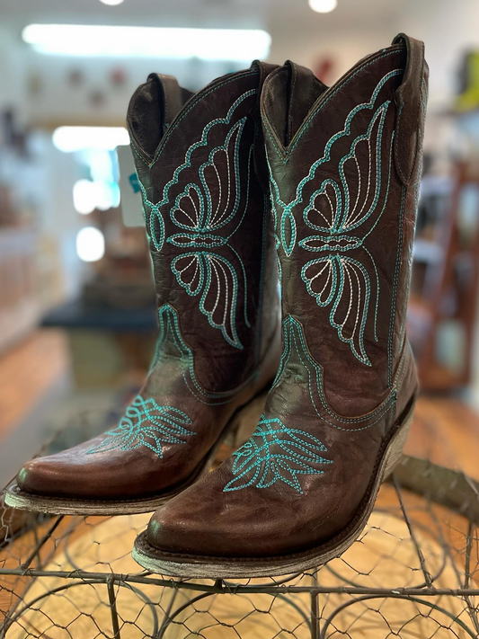 Butterfly Embroidery Almond-Toe Mid Calf Cowgirl Boots - Dark Brown