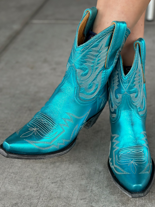 Metallic Snip-Toe Embroidery Wide Mid Calf Short Cowgirl Boots - Turquoise