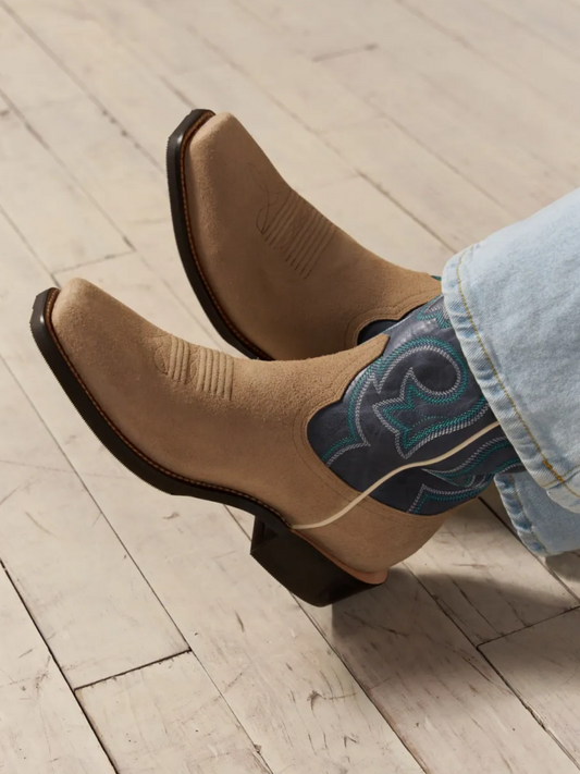 Contrast Indigo And Tan Faux Suede Square-Toe Embroidery Cutout Wide Mid Calf Cowgirl Boots