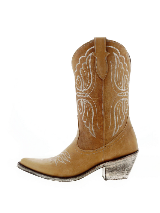 Butterfly Embroidery Almond-Toe Mid Calf Cowgirl Boots - Tan