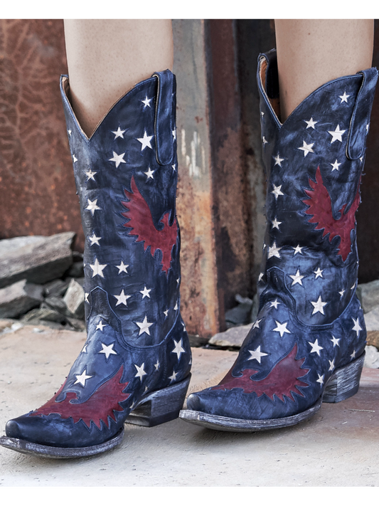 Navy Blue Snip-Toe Star And Eagle Inlay Wide Mid Calf Cowgirl Boots