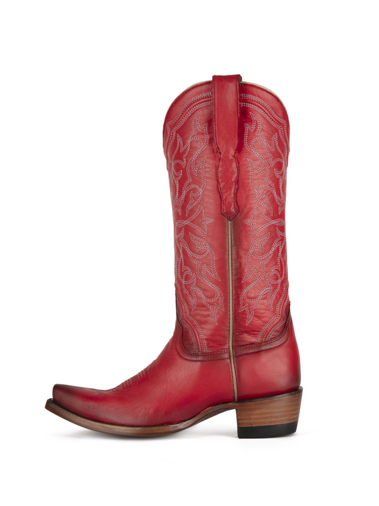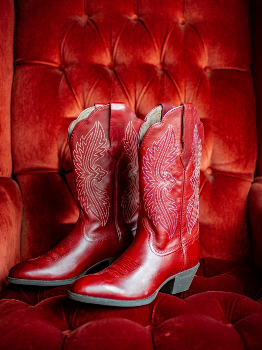 Burnish Red Vegan Leather Snip-Toe Embroidery Mid Calf Cowgirl Boots