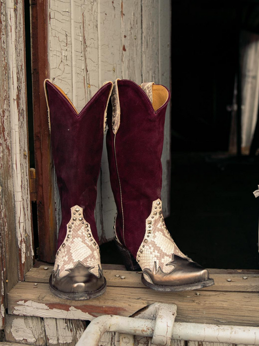 Contrast Snakeskin And Wine Red Faux Suede Studded Applique Snip-Toe Wide Mid Calf Cowgirl Boots