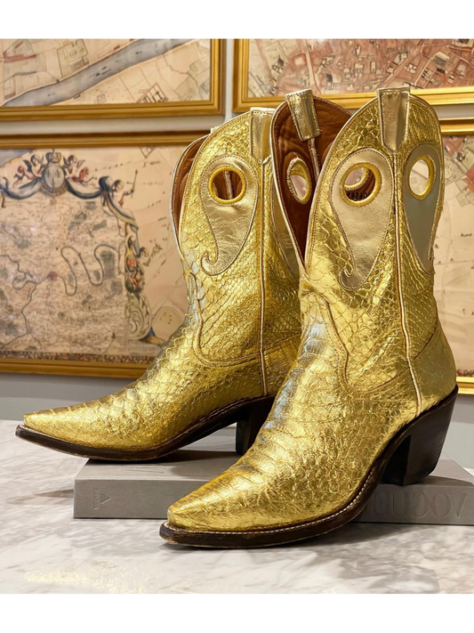 Metallic Gold Snakeskin Cutout Snip-Toe Mid Calf Cowgirl Boots With Mirrored Gold Paisley