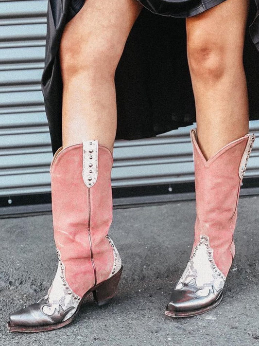Contrast Snakeskin And Pink Faux Suede Studded Applique Snip-Toe Mid Calf Cowgirl Boots