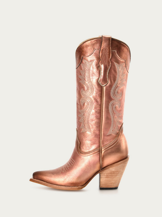 Metallic Rose Gold Embroidery Snip-Toe Mid Calf Cowgirl Boots