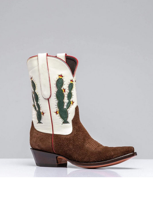 Contrast White And Chocolate Faux Suede Wide Mid Calf Cowgirl Boots With Cactus Inlay