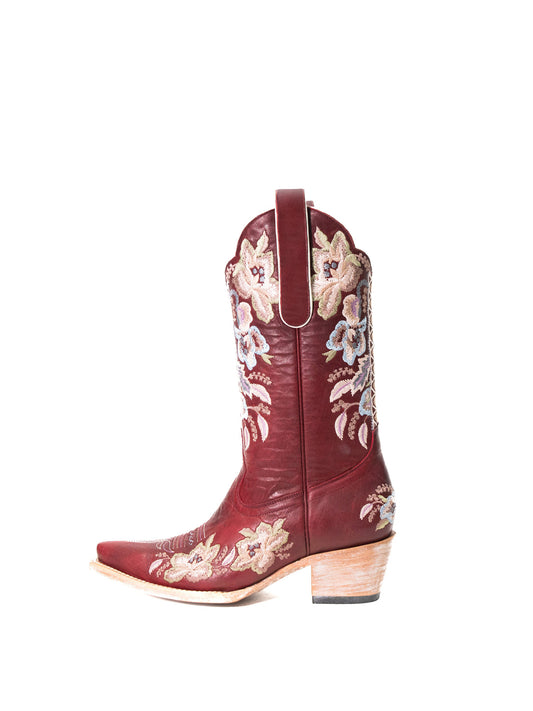 Dark Red Snip-Toe Vivid Flowers Embroidery Mid Calf Cowgirl Boots
