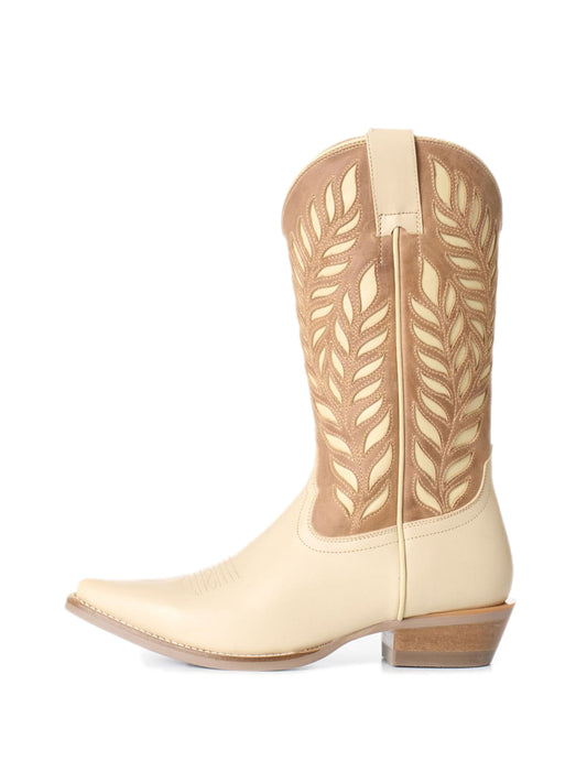 Contrast Bone And Tan Snip-Toe Leaves Inlay Mid Calf Cowgirl Boots