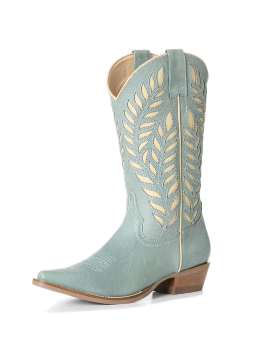 Green Snip-Toe Leaves Inlay Mid Calf Cowgirl Boots
