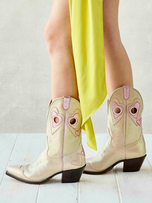 Metallic Light Pink Snip-Toe Colorful Heart Applique Cutout Mid Calf Cowgirl Boots