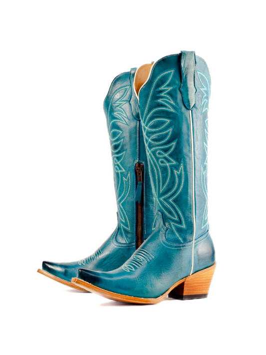 Indigo Snip-Toe Western Embroidery Half-Zip Mid Calf Cowgirl Boots